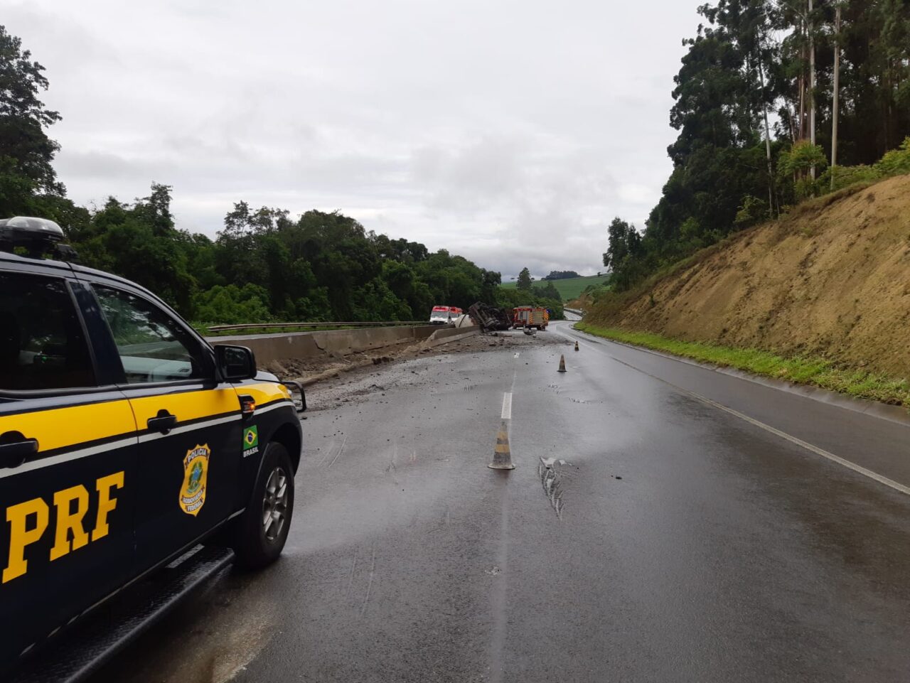 Por conta do risco de explosão, a Polícia Rodoviária Federal (PRF) interditou totalmente os dois sentidos da rodovia e não há previsão para liberação.